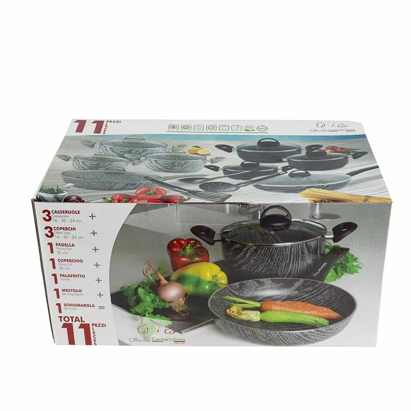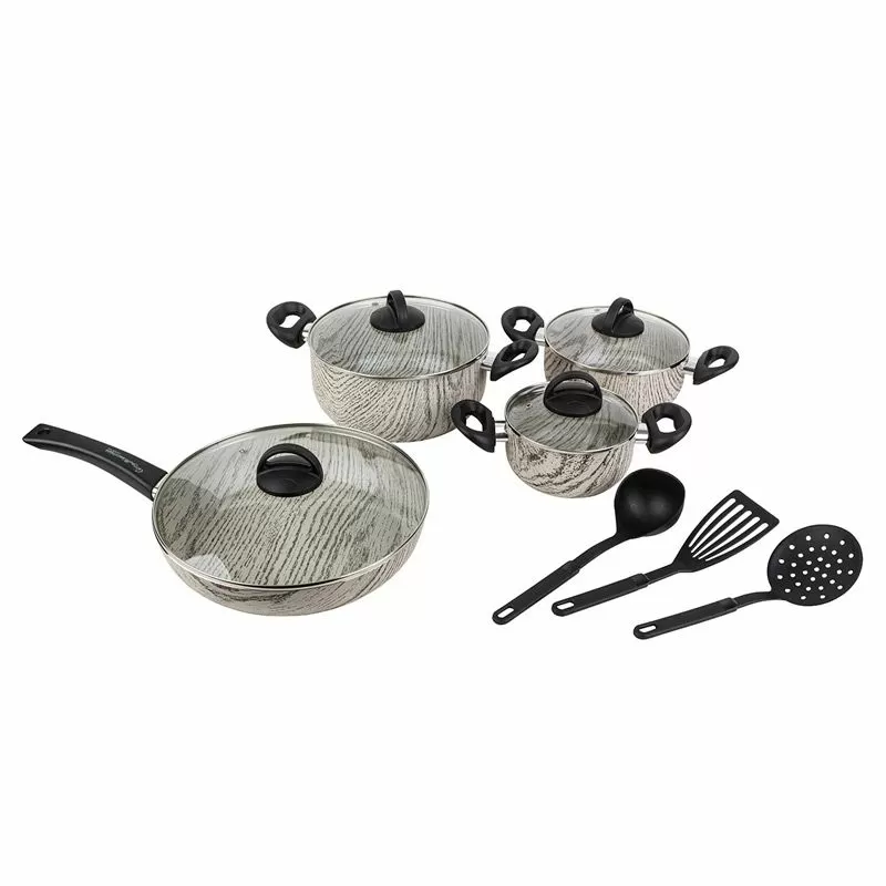 Комплект съдове за готвене и инструменти Cucina Italiana Duna с отличителен дървесен дизайн, който покрива всички ежедневни нужди в приготвянето на храна и внася хармония и забележителен стил в кухнята.