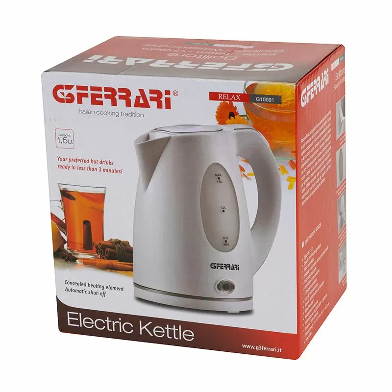 Насладата на любимата топла напитка по всяко време на деня е лесна и приятна каната G3 Ferrari Relax . С капацитет от 1,5l нуждите на малко семейство са готови за по-малко от три минути. Светлинният индикатор и система за суха защита, която се активира, ако не се открие вода в каната, за да се гарантира максимална безопасност при употреба, това устройство е оборудвано с подвижен филтър, контролен илюминатор и скрито съпротивление за лесно почистване от котлен камък и за да се осигури по-дълъг живот на продукта.