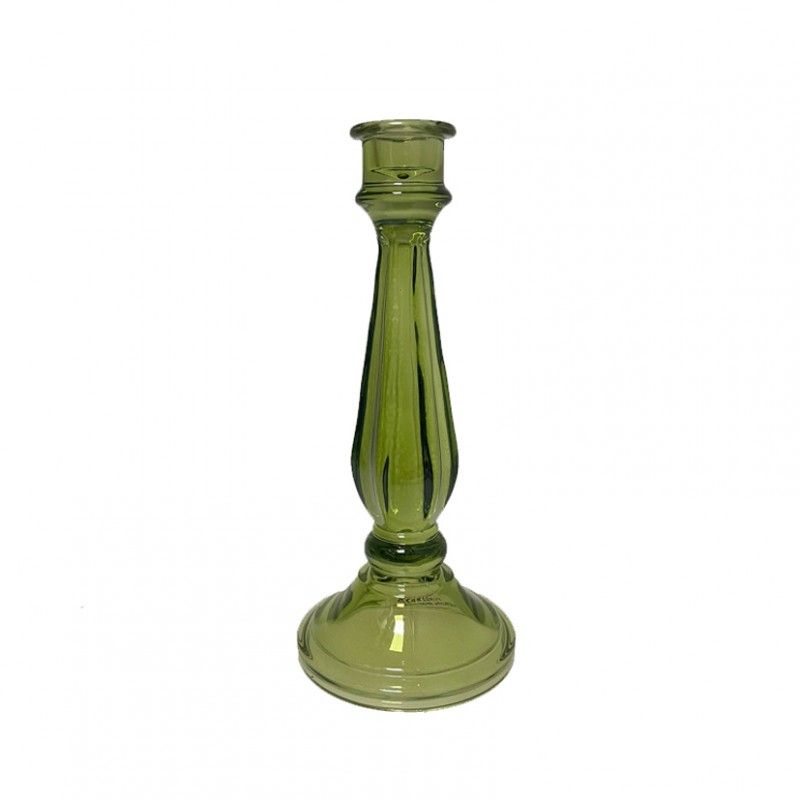 Стъклен свещник в зелено, с класически дизайн и елегатни извивки. Отлично решение да придадете изискана атмосфера и доза разкош на всяка трапеза.