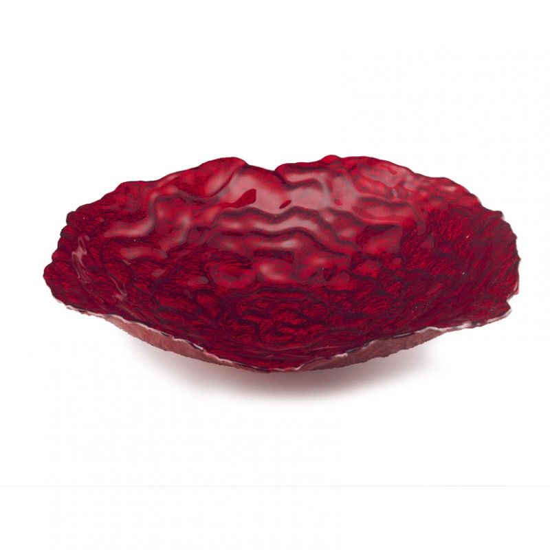 Арт стъклена купа, подходяща за бонбони или декоративен предмет, характеризираща се с наситения си рубиненочервен цвят и текстуриран ефектен дизайн.