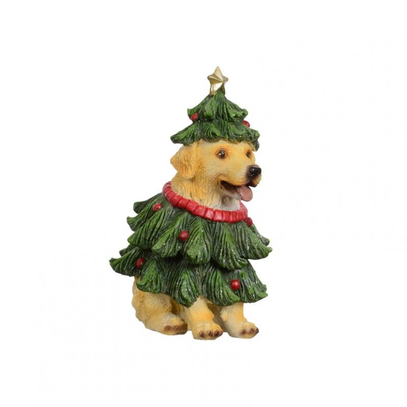 Внесете празнично забавление в декора си с тази коледна украса за елха „Куче“ от полирезин (14 см). Тази очарователна фигурка изобразява весело куче, облечено като коледна елха, с пластове зелени клонки, червени топки и златна звезда като украса.
